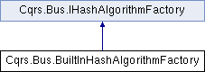 Inheritance diagram for Cqrs.Bus.BuiltInHashAlgorithmFactory:Public Member Functions | |