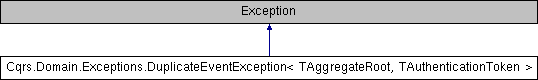 Inheritance diagram for Cqrs.Domain.Exceptions.DuplicateEventException< TAggregateRoot, TAuthenticationToken >:Public Member Functions | |