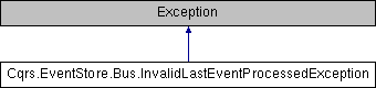 Inheritance diagram for Cqrs.EventStore.Bus.InvalidLastEventProcessedException:Public Member Functions | |