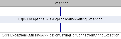 Inheritance diagram for Cqrs.Exceptions.MissingApplicationSettingForConnectionStringException:Public Member Functions | |